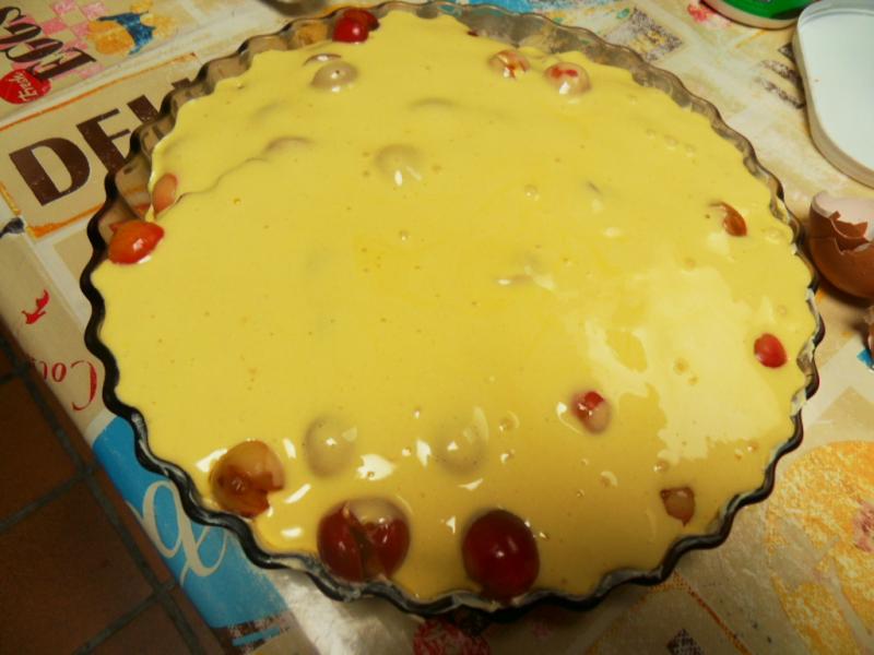 dans un saladier battre les oeufs en omelette, ajoutez le sucre et le sel fouetter 5 mn beurrer un plat a gratin disposer les cerises ètalez la pâte, enfourner 45mn