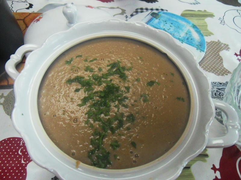 j'ai fait revenir oignons un peu d'ail , ajouter 1 kg de champignons frais cube de poule, gigembre un peu de tapioca pour apaisir j'ai mis du lait à la place de crème fraiche, sel poivre, je fais un peu au pif, un peu de persil haché