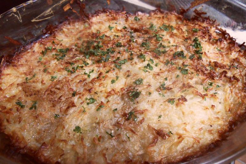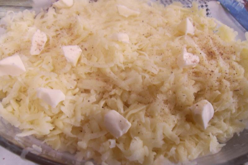 disposez une première couche de pommes de terre râpées, salez et poivrez, parsemez de noix de muscade