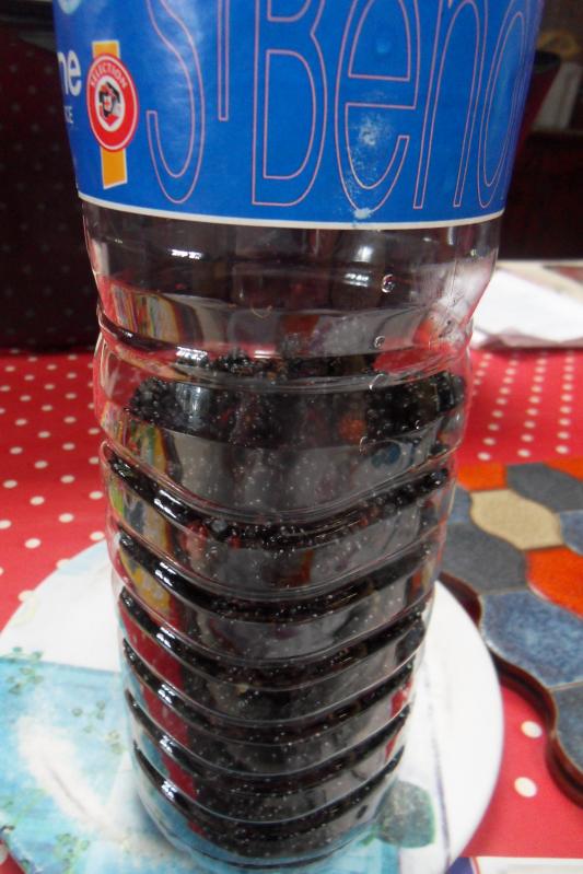 samedi dernier, je suis monté au bois, j'ai cueuillie quelque mûres 600gr, avec une bouteille plastique, c'est un ami qui m'a donné l'idée en vacances il a rammené à sa maman des mûres pour les confitures! dans des bouteilles plastique.