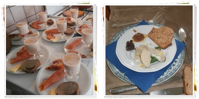 et une assiette "saumon" : mon incontournable mousse de saumon, une tranche de saumon fumé, des crevettes cuites par mes soins dans un bouillon très parfumé et très relevé - du pain au citron (fait par mon boulanger chez qui j avais commandé aussi du pain aux figues, du pain de seigle et du pain aux noix)