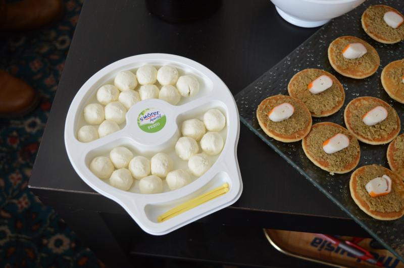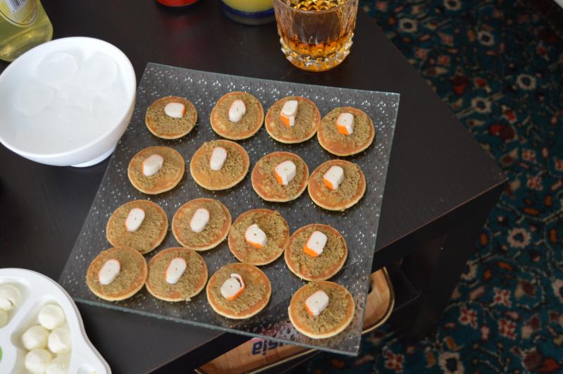 j avais tout de même un peu travaillé en faisant cette assiette de blinis tartinés de tapenade verte et surmontés d un morceau de surimi classique
