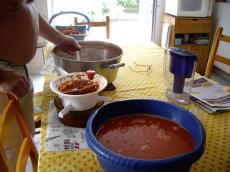 nous avons ramassé toutes les tomates cerises du jardin (et il y en avait!!!) les tomates normales et nous avons passé la journée à faire le coulis pour mettre au congélateur pour faire toutes les sauces tomates et autres soupes de l hiver - cette année j ai mis des tomates, du laurier, du thym, du basilic et tout cela à mijoter pendant 2 heures puis passé au moulin à légumes (le boulot de Monsieur!!!) remis à mijoter pendant 3/4 heures et enfin dans des bouteilles de lait vidées, au congélateur