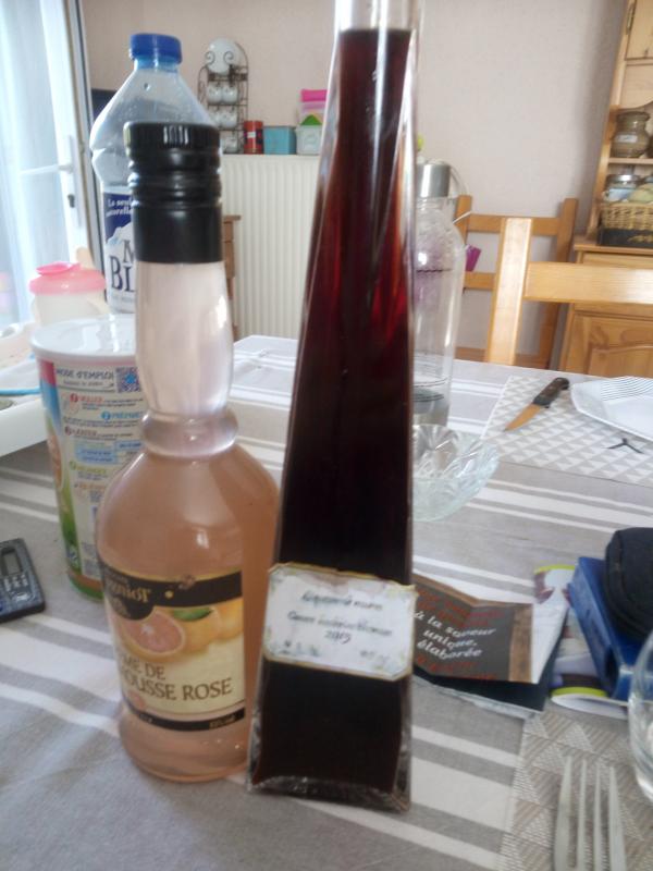 Avec du vin blanc 1/2 sec acheté lors de la journée portes ouvertes à Tayac en juillet j ai préparé des "kir" Un traditionnel avec une excellente liqueur de mûres offerte par Annick lors de notre rencontre l an passé et l autre avec de la liqueur de pamplemousse rose là aussi bon succès 😜