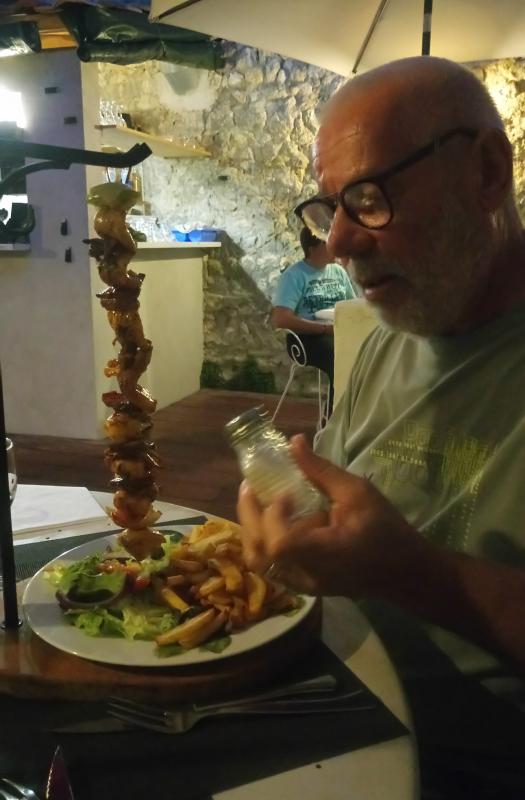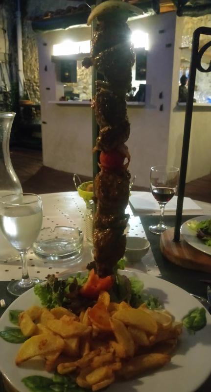 Nous on a pris chipirons et bœuf : jolie présentation dans l assiette l accompagnement frites maison et la salade avec une petite sauce délicieuse et la brochette pendante