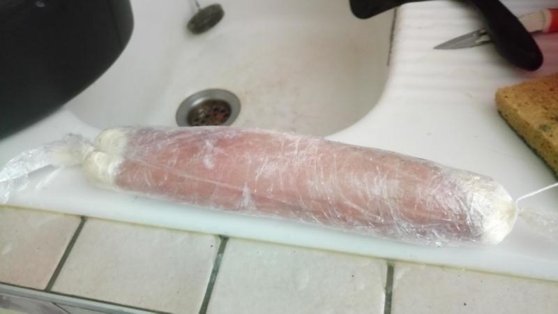 Puis j ai roule dans du film étirable et fait cuire dans une casserole d eau