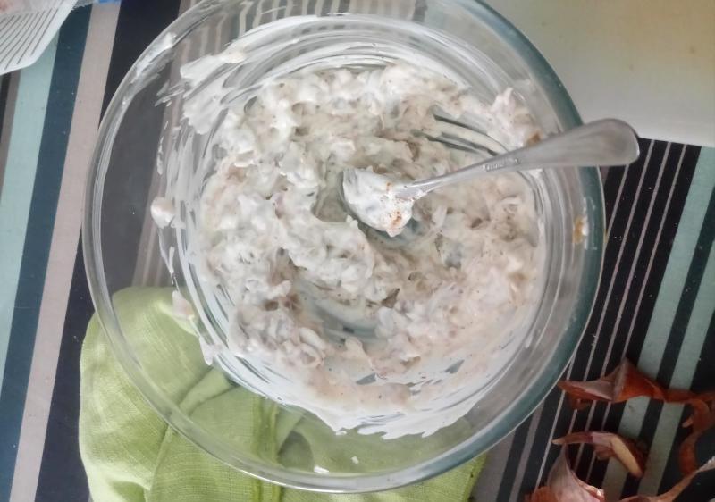 voilà ma préparation au fromage blanc/champignons (en boite)/échalotte le tout haché très finement + sel/poivre/piment d espelette