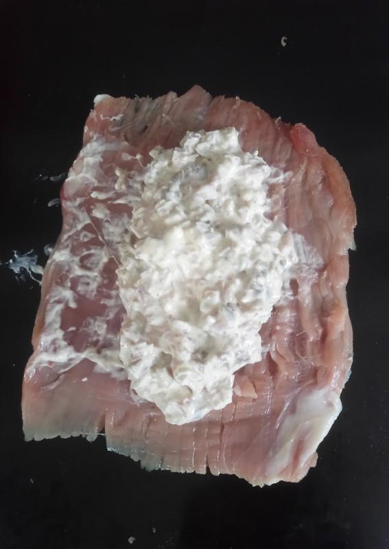 bien étalé sur mon escalope bien aplatie au rouleau à patisserie!!!!!!!!!!!!! que j ai ensuite roulée dans du film étirable bien serrée et mis à cuire au bain-marie