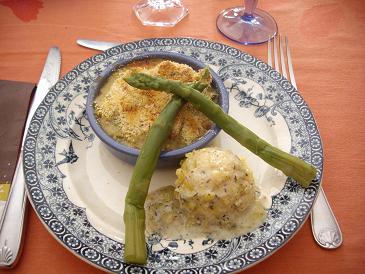 nous sommes passés au plat préparé par mon autre fille : cassolettes de filets de dinde au thym, accompagnés d asperge et d une boule de polenta