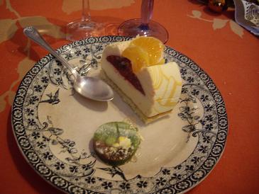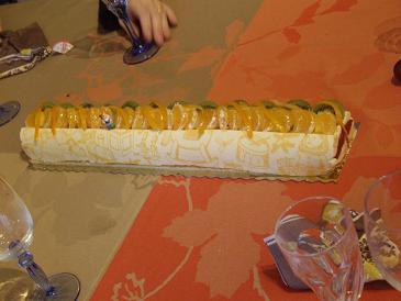 puis après la salade et le fromage, prévus par ma belle fille, nous sommes arrivés au dessert une magnifique bûche aux fruits : mandarine, kiwis, ananas apportée par les beaux-parents de ma fille (qui étaient aussi de la partie)