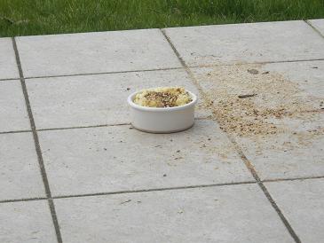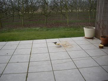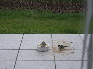 et ils ne se trompent pas entre les miettes par terre (qu ils ont tous les jours) le pot de "foie gras" le nouveau plat est bien meilleur - je ne mets pas dans les assiettes car lorsqu il pleut tout baigne ensuite dans l eau et ils ne le picorent plus - de plus en ce moment l assiette est gelée) par terre à part la neige de l autre jour cela ne risque rien sauf d attirer les rats - dès qu il va faire meilleur mon mari va réinstaller la petite maison à oiseaux près de la terrasse (cela me sera en plus plus facile pour la réaprovisonner en évitant de marcher dans l herbe bien mouillée en cette saison)