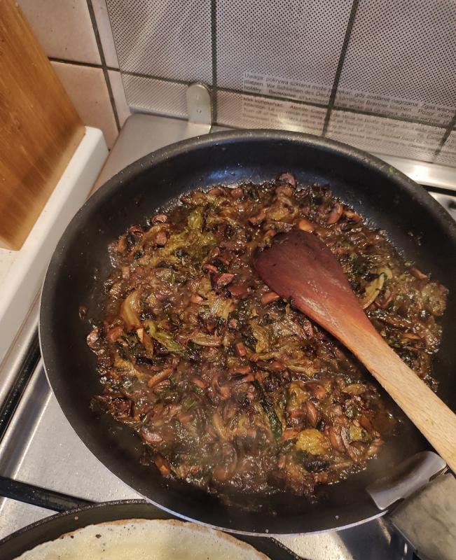 j ai fait revenir dans du beurre et huile d olive des champignons et de la salade qui était un peu trop avancée pour faire justement en salade!!!!! une échalotte, un peu de persil frais - déglacé au vin blanc et mijoté une bonne 1/2 heure
