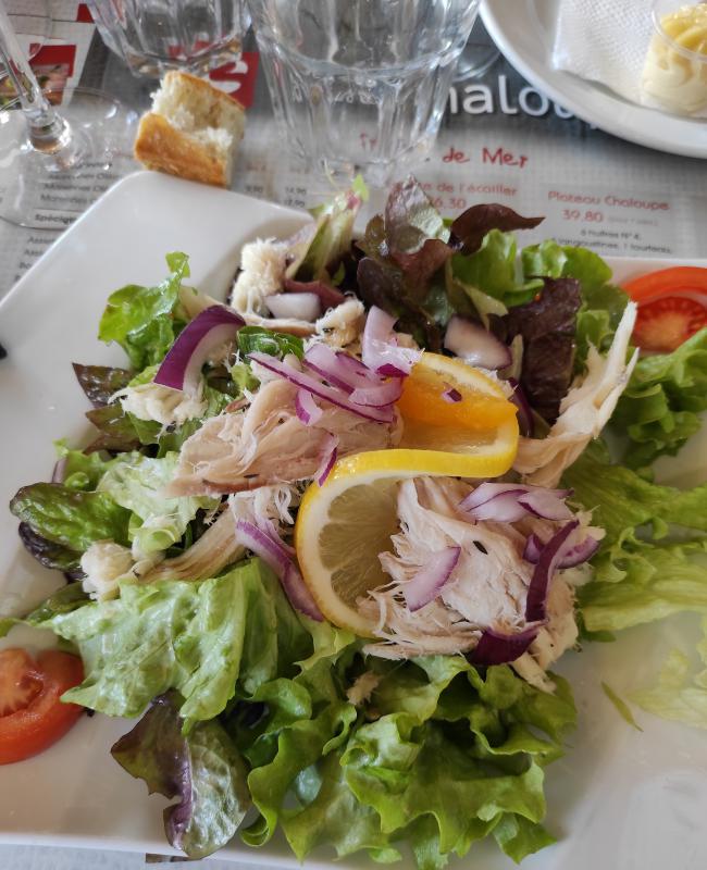 une salade de raie aux agrumes pendant que mon mari dégustait une assiette de crevettes roses