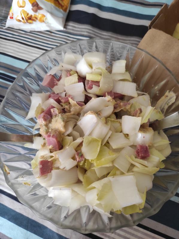 Il me restait 2 tranches de jambonneau que j avais fait la veille avec des lentilles, au frigo des endives : une petite salade en entrée toute trouvée