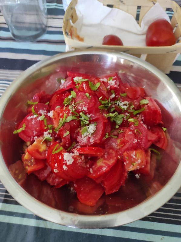 et voilà ma salade de tomates servie en entrée avec de la fleur de sel de guérande, un peu d huile d olive de provence et beaucoup de basilic du jardin