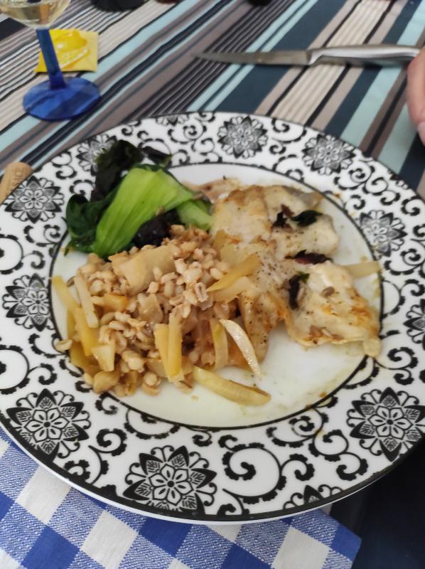 - du filet de turbot laque au beurre d algues accompagné d un risotto de céréales aux légumes racines