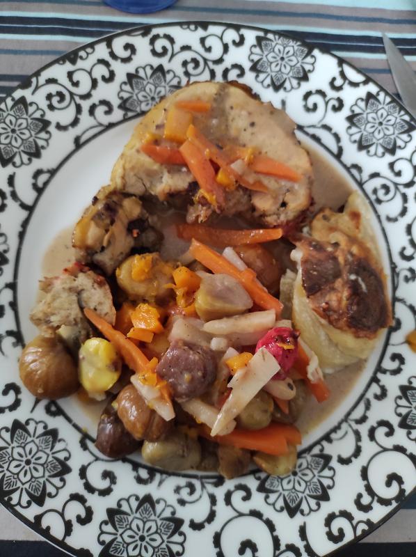 - du chapon fermier roti en deux cuissons peau croutée au jus accompagné de butternut et chataigne