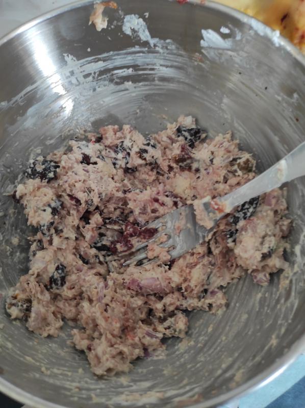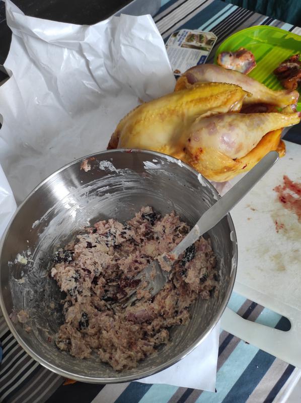 pour la farce j ai fait avec ce que j avais : du jambon, un reste de viande rouge, un peu de chair à saucisses, les abats, de l échalotte des pruneaux et des herbes le tout lié avec un oeuf et de la crème fraiche et de la mie de pain