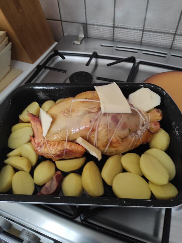 LE POULET/POMMES DE TERRE AVEC SA PETITE FARCE ET CUIT AU FOUR