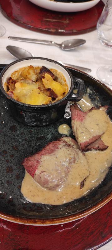 puis du roti de boeuf sauce aux champignons accompagné d une cassolette de pdt rissolées gratinées au fromage de brebis