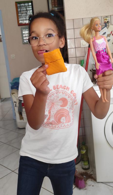 elle a fait une jupe pour sa poupée Barbie (que Mamy a bien sûr finie)