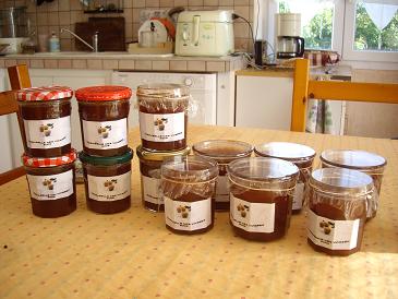 et voilà ma production de confiture : en tout 12 pots qui je suis sûre vont faire des heureux - la grand mère de Romain m a donné aussi 3 pots de confiture de cerises qu elle avait faite avant notre arrivée - car là bas aussi les cerisiers ont beaucoup donné cette année et elle en a fait de la confiture mais mis aussi au congélateur pour les tartes aux cerises et autres clafoutis pour cet hiver