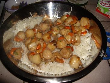 j avais profité d une promotion pour faire le plein du congélateur en coquilles st jacques et voilà à midi un petit plat vite fait : - faire revenir des échalottes dans un peu de beurre - rajouter les coquilles - lorsque c est bien rissolé faire flamber avec un peu de banuyls - assaisonner - rajouter un peu de crème liquide et laisser réduire - servir avec un riz nature