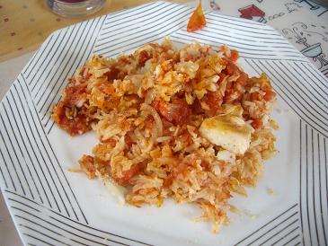 - après l avoir égoutté je l ai mise dans un plat avec un filet d huile d olive, un peu d ail, une boite de tomates en dés, un peu de vin blanc, un peu de thym, de laurier, sel/poivre