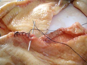 tout d abord un peu de couture car l éleveur a du avoir un peu de mal pour vider le jabot et il a du entailler le cou - de toute façon il faut aussi coudre une extrémité pour éviter que la farce ressorte et lorsqu il est bien farci il faut fermer l autre pour avoir un boudin bien hermétique