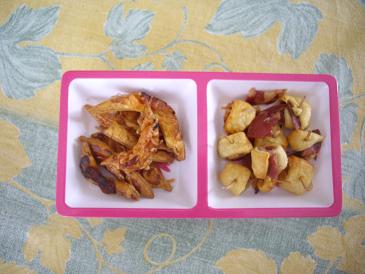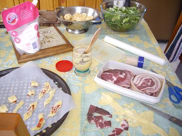 - avec les autres j ai fait des petites bouchées avec la charcuterie qui me restait de la raclette de la veille : chorizo et bacon -