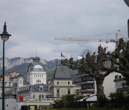 au 1er plan la mairie qui fait tout "rikiki" à côté de la coupole du palais lumière et le panorama montagneux autour