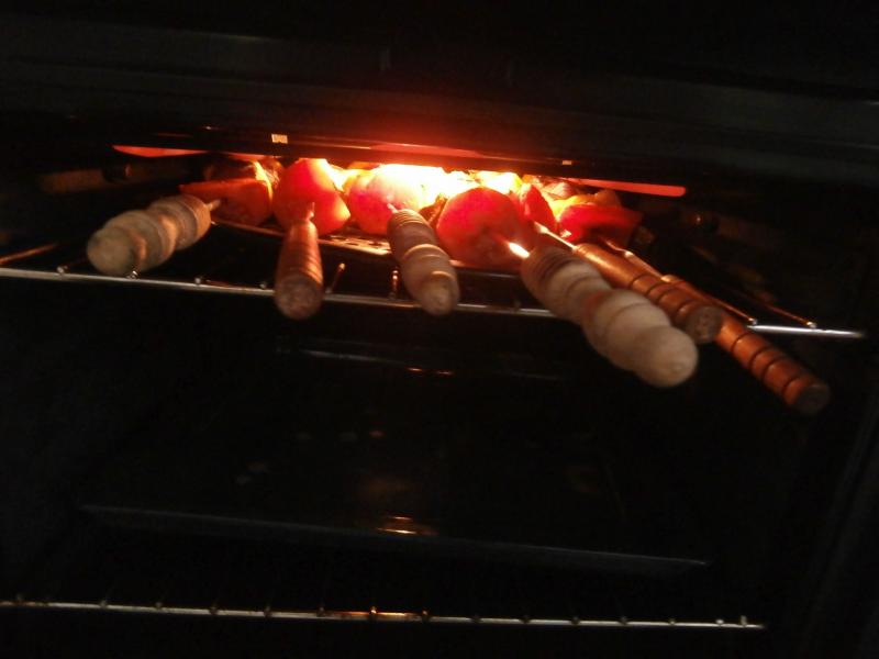 de belles brochettes faites maison : viande rouge, tomates, poivrons, oignon rouge assaisonnée d un filet d huile d olive, de sel à la tomate et de piment d espelette