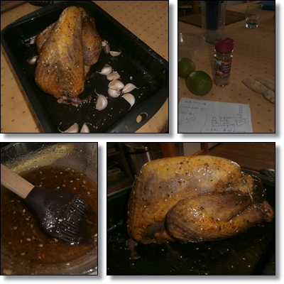 étape 1 : mélanger le miel + gingembre rapé + zeste et jus des citrons + épices avec de l huile et bien en badigeonner la pintade avec un pinceau