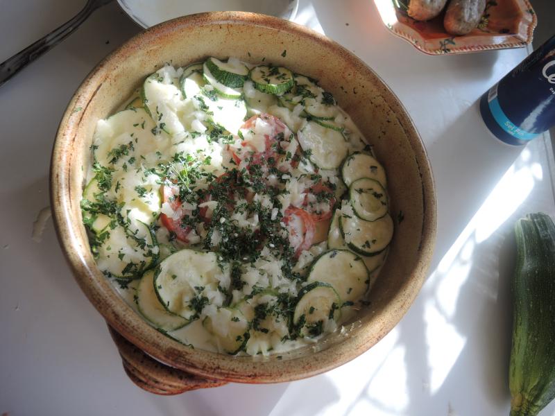 Ingrédients : 1 courgette - 2 à 3 tomates - 2 petits oignons - persil - 20 cl de crème fraîche - margarine (pour le plat) - un peu de laitsel, poivre