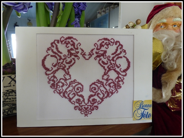 Cette année, le Père Noël fait de nombreux aller et retour pour venir jusqu'à Royan. Il s'est même laissé photographier lorsqu'il m'a apporté ce magnifique coeur brodé par Michèle de Paris, une amie connue par mon blog et qui me gâte à chaque fin d'année. Encore merci Michèle pour cette jolie broderie qui va rejoindre ma collection de coeurs toute récemment accrochée dans notre nouvelle maison.