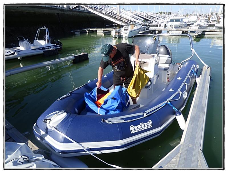 Roger enlève la housse de protection et en profite pour ranger tout le nécessaire de sécurité obligatoire dans un bateau.