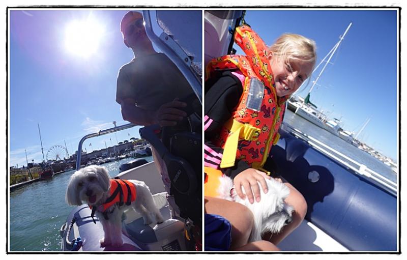 Nous partons à deux bateaux avec nos amis Aurélie et Pascal et les enfants sans oublier Hinès, bien sûr.... qui en profite pour se faire chouchouter par Coline.