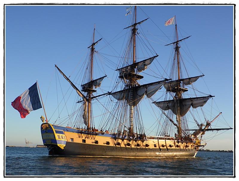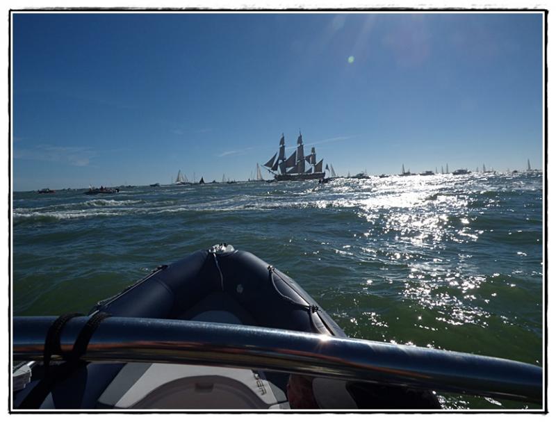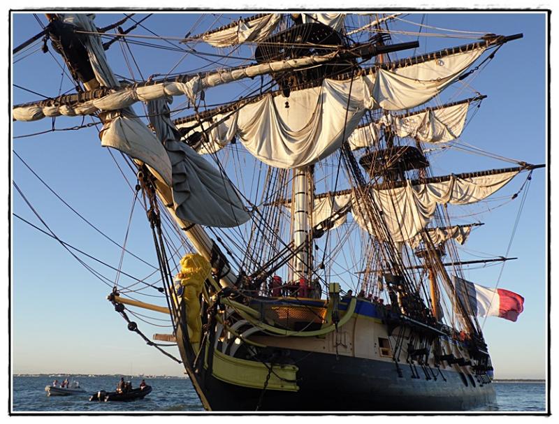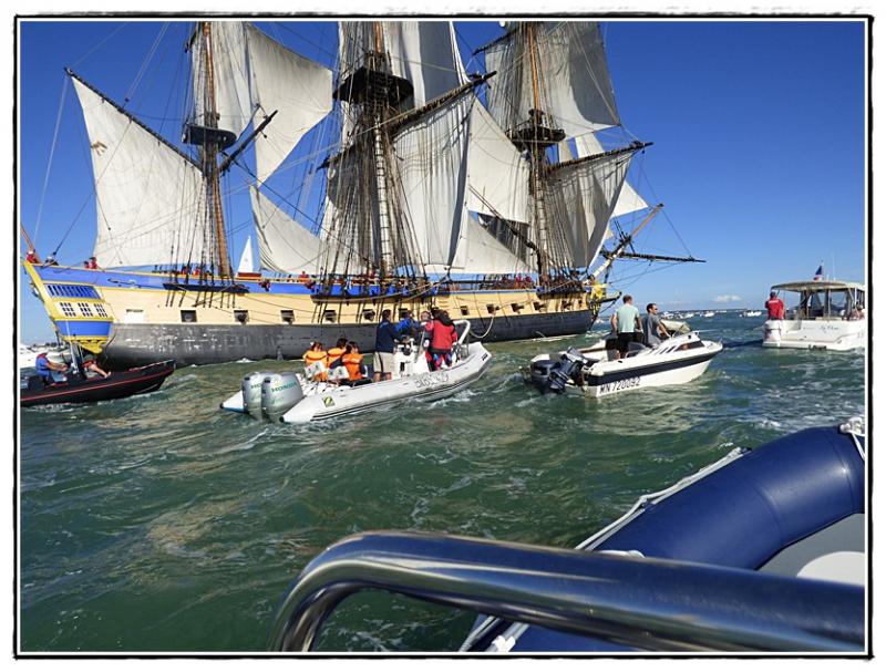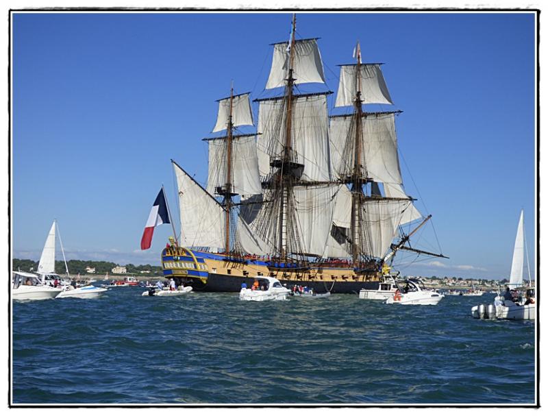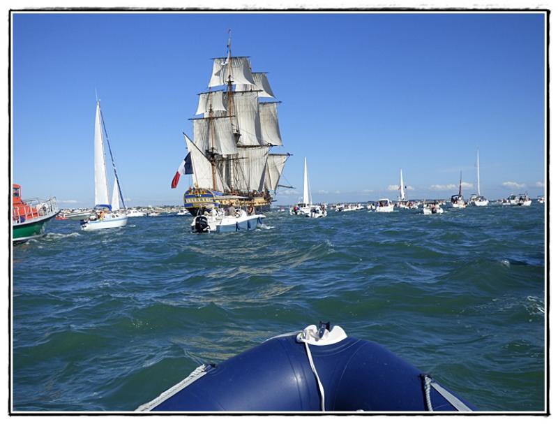 Nous apercevons la sihouette de la frégate construite à Rochefort. Elle est escortée par de nombreux plaisanciers....