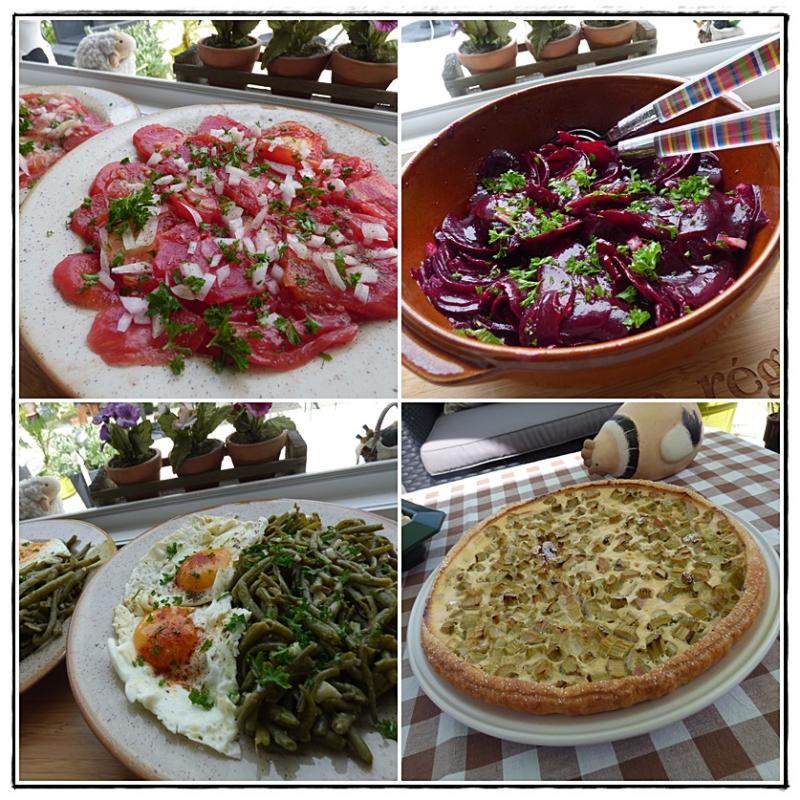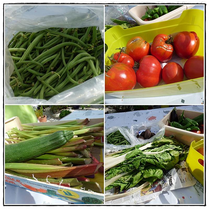 Rhubarbe, courgette, blettes, betteraves rouges, haricots verts, poivrons verts, aubergines, tomates.... pas besoin d'aller au marché cette semaine....
