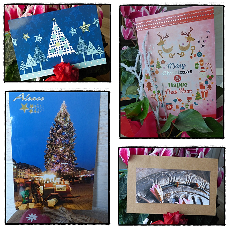 Voici quelques jolies et gentilles cartes reçues avant notre départ en Lorraine. Merci Martine et Patrice pour vos pensées au cours de votre week-end alsacien. Je sais que nous ne sommes jamais oubliés lors de vos voyages. Merci Lisette et Danièle pour vos souhaits sincères et merci à mes enfants qui nous ont envoyé cette gentille carte avant notre départ.
