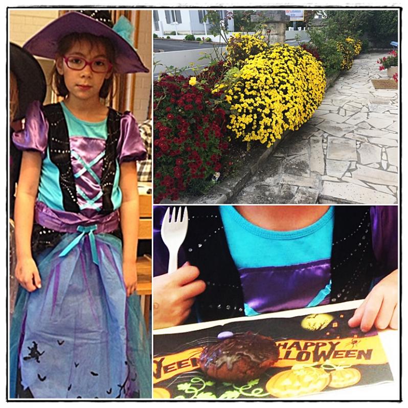 Les petits chrysanthèmes fleurissent sur le devant de la maison et Lucie fête Halloween à l'école...