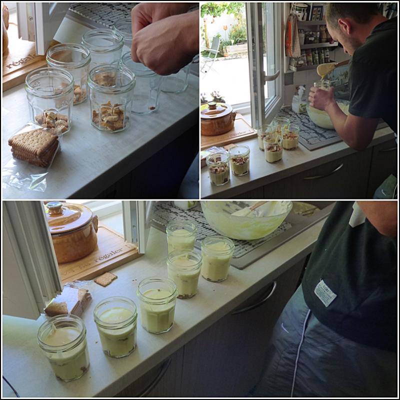 Dans des verrines ou des pots de confitures "Bonne Maman" (et oui, nous sommes gourmands...), casser les petits beurre et déposer une couche au fond de la verrine.
