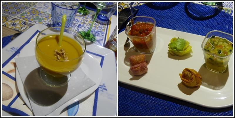 Deux verrines (tartare de tomates et thon) et (tartare de courgettes et poulet au curry) et des petits croustillants colorés (produits surgelés) ont complété cette entrée.