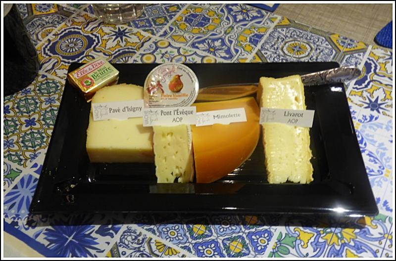 Depuis quelque temps, je trouve ces petits plateaux de fromages en vente au supermarché. Celui-ci vient de Super U. Chaque plateau regroupe les fromages d'une région comme par exemple celui-ci, la Normandie avec le Pavé d'Isigny, le Pont l'Evêque, la Mimolette et le Livarot qui sont tous les 4, des fromages de vache. La cerise sur le gâteau, c'est le carré de beurre et une petite portion de confiture de poire à la vanille.