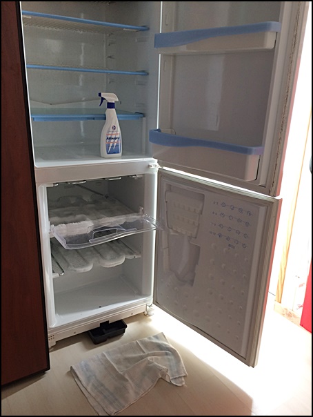Comme je suis venue presque à bout du contenu du petit congélateur, les dernières denrées ont été tranférées dans le grand congélateur, ce qui me permet à présent de pouvoir dégivrer mon réfrigérateur-congélateur. Je suis obligée de dégivrer tout en même temps, il n'y a qu'un seul moteur pour les deux parties.