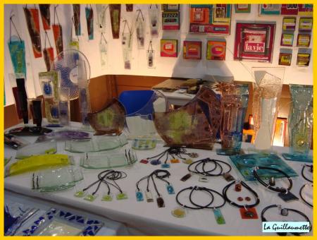Vaisselle, bijoux, décorations en verre de couleurs