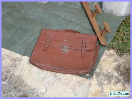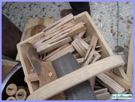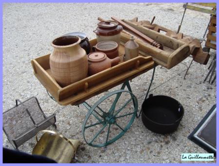 Pots anciens, fléau pour battre le blé, joug de boeuf, panier à bûches.....