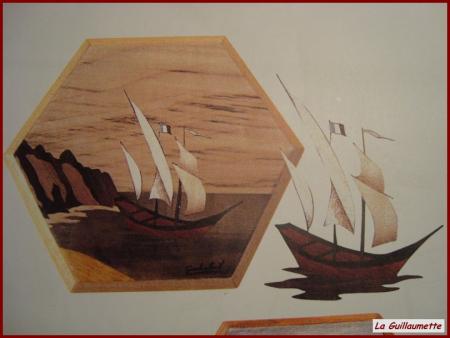Vous allez certainement être étonnés en voyant la photo mais j'ai changé d'avis et je n'ai pas garni le plateau avec ma marquéterie. Roger a trouvé que ce serait plus beau d'en faire un cadre et que mon bateau serait plus mis en valeur. J'ai suivi ses conseils.... Il est vrai que j'ai déjà fait 2 plateaux. Et vous, qu'en pensez-vous? Le voici encadré....