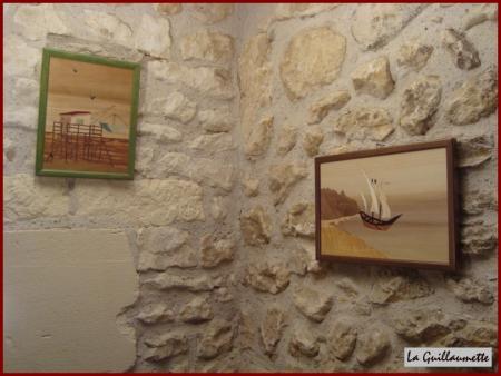 Roger a terminé son bricolage. Il a accroché mon tableau que j'avais fait en marquéterie. Il tient compagnie au carrelet de Roger réalisé aussi en marquéterie. Quand je suis devant mon PC, je profite des deux. Ils sont juste accrochés au mur face à moi!