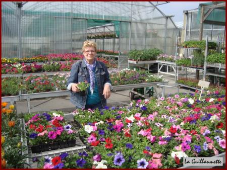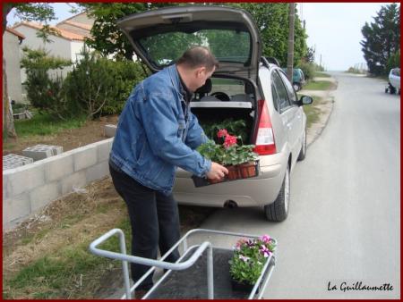 Nous pensons venir habiter définitivement à Meschers fin mai - début juin au plus tard. Et à ce moment-là, Roger n'aurait peut-être plus trouvé de plants de tomates et autres légumes à repiquer au jardin. Moi aussi, j'en ai profité pour acheter quelques pots de géraniums pour accrocher aux fenêtres du haut et une barquette de pétunias pour faire quelques jardinières. Quand je vais dans ce genre d'endroit, je voudrais acheter toutes sortes de fleurs mais il faut être raisonnable car la note monte vite!!!!
